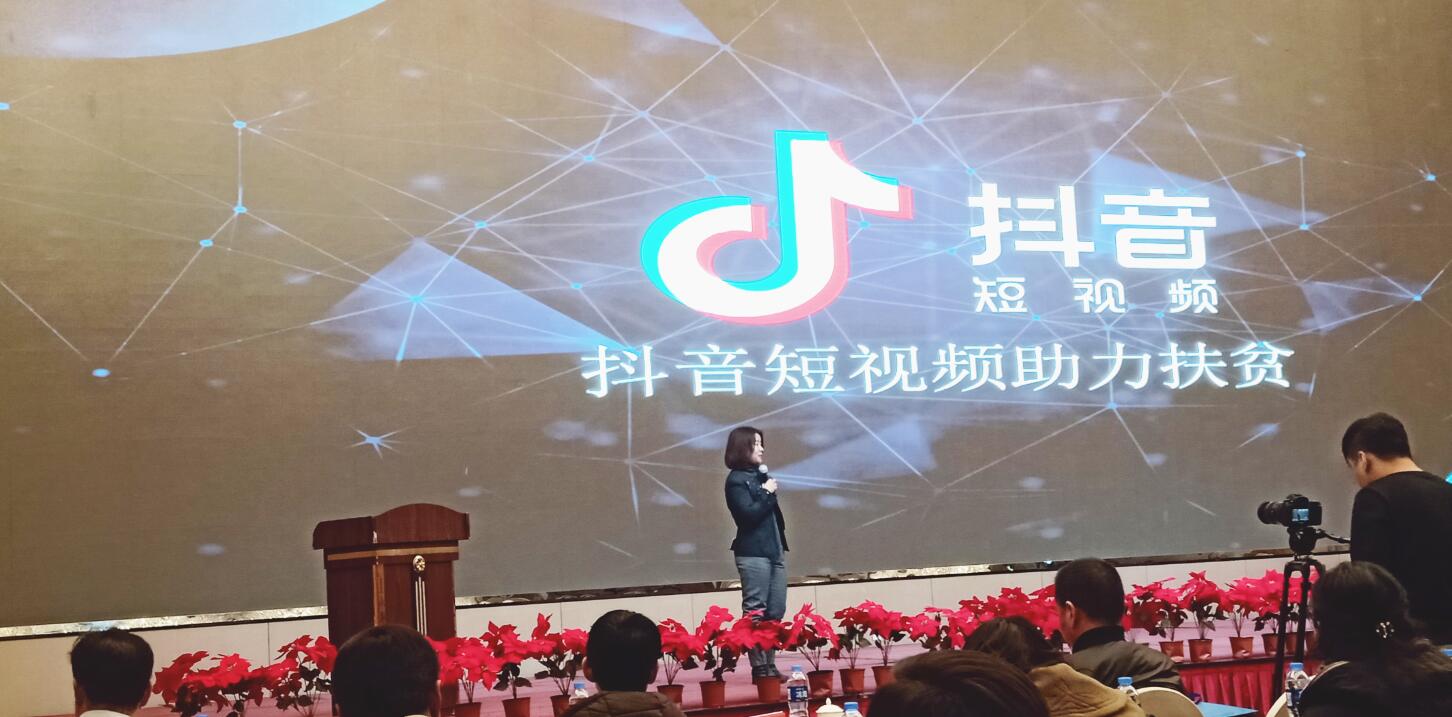 北京字節(jié)跳動(dòng)科技有限公司政務(wù)總監(jiān)杜曉靜通過(guò)旗下今日頭條、抖音、火山、西瓜視頻等為與會(huì)企業(yè)講解網(wǎng)紅帶貨模式助力產(chǎn)業(yè)扶貧。
