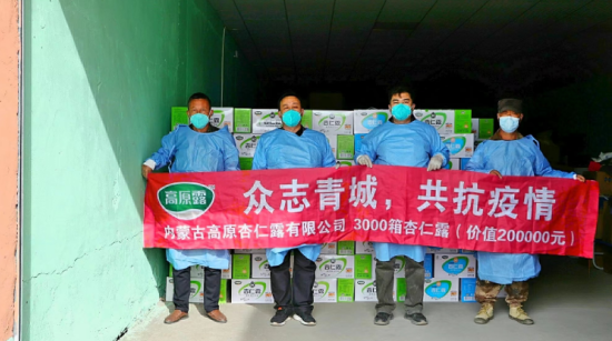 20、常務(wù)理事單位-內(nèi)蒙古高原杏仁露有限公司:近日,內(nèi)蒙古高原杏仁露有限公司向玉泉區(qū)捐贈(zèng)了價(jià)值12萬余元的高原杏仁露,本次捐贈(zèng)表達(dá)了對(duì)所有抗疫工作人員的熱切關(guān)懷和暖暖情意,感謝所有逆行者“疫”無反顧的擔(dān)當(dāng)與堅(jiān)守。