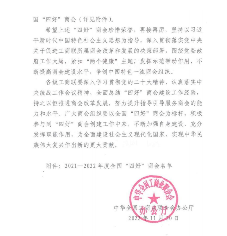 再次榮獲全國(guó)“四好”商會(huì)榮譽(yù)稱號(hào)