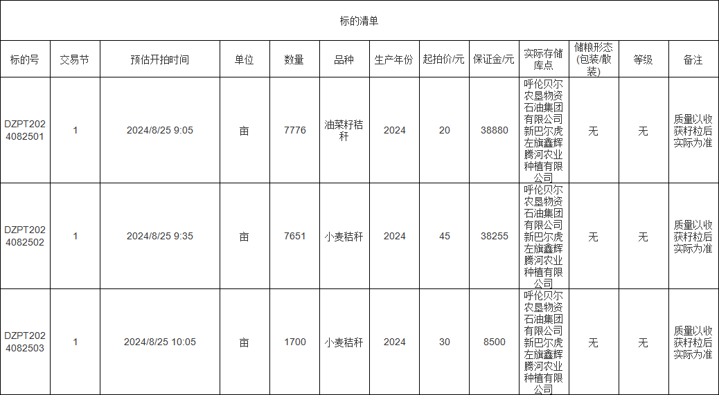 轉(zhuǎn)讓標(biāo)的為油菜籽秸稈、小麥秸稈、小麥秸稈,涉及面積油菜籽秸稈7776畝、小麥秸稈7651畝、小麥秸稈1700畝,意向受讓方在競(jìng)買前應(yīng)自行對(duì)標(biāo)的預(yù)估數(shù)量和質(zhì)量情況進(jìn)行充分了解,交易標(biāo)的均以實(shí)際狀況為準(zhǔn)。標(biāo)的存放地位于呼倫貝爾農(nóng)墾物資石油集團(tuán)有限公司新巴爾虎左旗鑫輝騰河農(nóng)業(yè)種植有限公司,詳情見標(biāo)的清單: