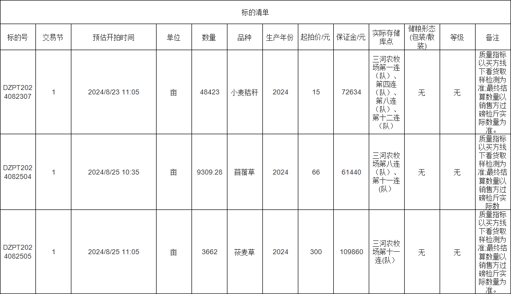 轉(zhuǎn)讓標(biāo)的為苜蓿草、莜麥草、小麥秸稈,涉及面積苜蓿草9309.28畝、莜麥草3662畝、小麥秸稈48423畝,意向受讓方在競(jìng)標(biāo)前應(yīng)自行對(duì)標(biāo)的預(yù)估數(shù)量和質(zhì)量情況進(jìn)行充分了解,交易標(biāo)的均以實(shí)際狀況為準(zhǔn)。標(biāo)的存放地位于三河農(nóng)牧場(chǎng),詳情見(jiàn)標(biāo)的清單: