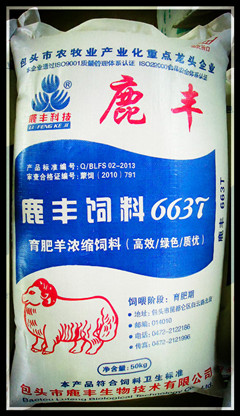 B、育肥羊濃縮飼料:執(zhí)行標(biāo)準(zhǔn)Q/BLFS02-2013,主要原料組成:豆粕、菜粕、棉粕、DDGS、石粉、磷酸氫鈣、食鹽、復(fù)合預(yù)混料等。產(chǎn)品成分保證值:粗蛋白≧35.0,粗纖維≦14.0,粗灰分≦20.0,鈣1.8-4.0,總磷≧0.8,鹽1.0-2.0,水分≦14.0、賴氨酸≧0.8。