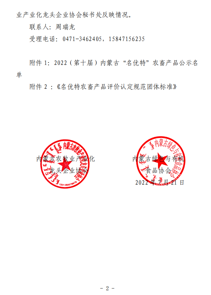 2022(第十屆)內蒙古“名優(yōu)特”農畜產品認定公示名單