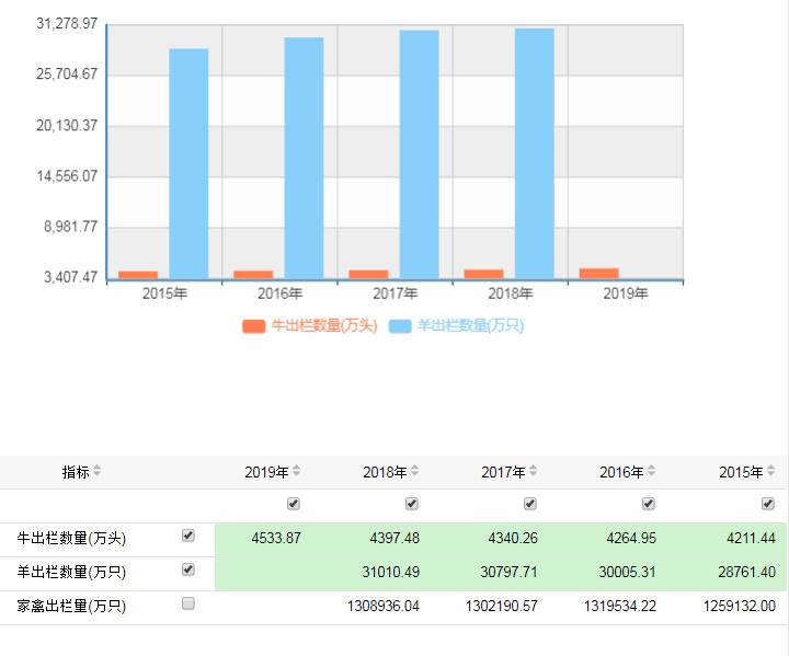 全國(guó)2015-2019年牛、羊、豬出欄情況
