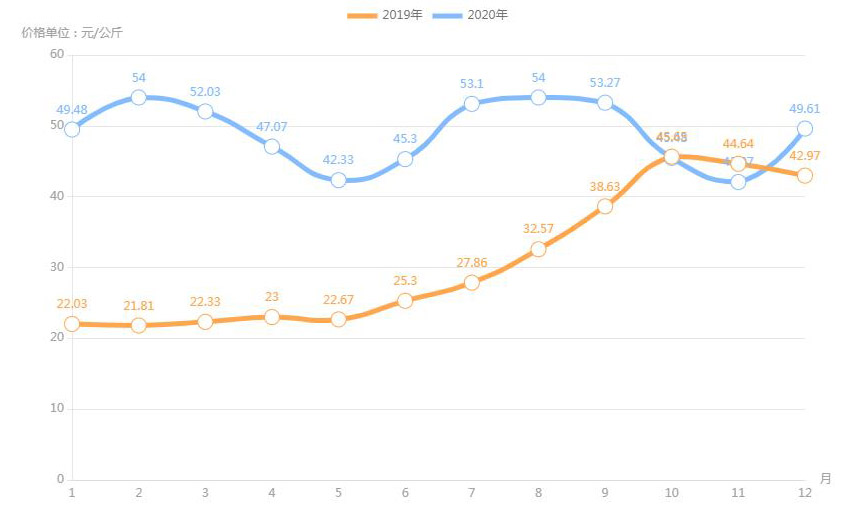 據(jù)農(nóng)業(yè)農(nóng)村部對(duì)全國(guó)500個(gè)集貿(mào)市場(chǎng)監(jiān)測(cè),2020年12月第二周,全國(guó)羊肉價(jià)格為每公斤82.66元,連續(xù)八周上漲,同比上漲3.6%。業(yè)內(nèi)人透露,目前,養(yǎng)羊成本上升;人們對(duì)羊肉品質(zhì)的要求也越來(lái)越高,消費(fèi)者更加傾向于選擇有質(zhì)量認(rèn)證標(biāo)志和品牌的羊肉產(chǎn)品,特別是優(yōu)質(zhì)、味美的新鮮羊肉,加上羊肉產(chǎn)量不高,供應(yīng)不足,拉動(dòng)了羊肉價(jià)格上漲。