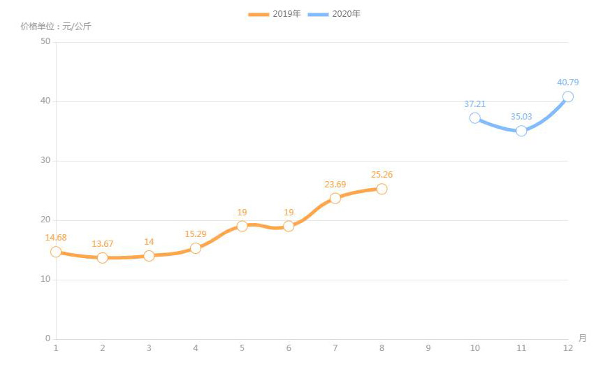 豬肉(白條豬)最高價(jià)格出現(xiàn)在2020年12月40.79元/公斤,最低價(jià)格出現(xiàn)在2019年2月13.67元/公斤。