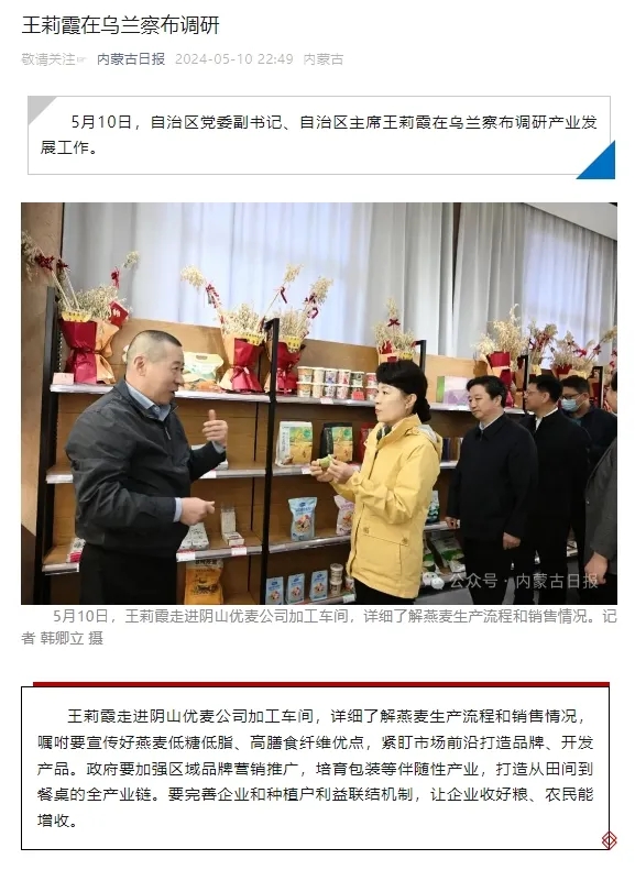 內蒙古自治區(qū)主席王莉霞在烏蘭察布市調研,深入陰山優(yōu)麥了解燕麥產(chǎn)業(yè)發(fā)展情況